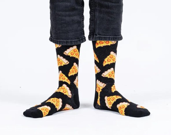 Bring the flavor to your feet with our Pepperoni Pizza Socks! Perfect for pizza lovers, these bold black crew socks are topped with a cheesy pepperoni design that’s sure to make your outfit extra tasty.